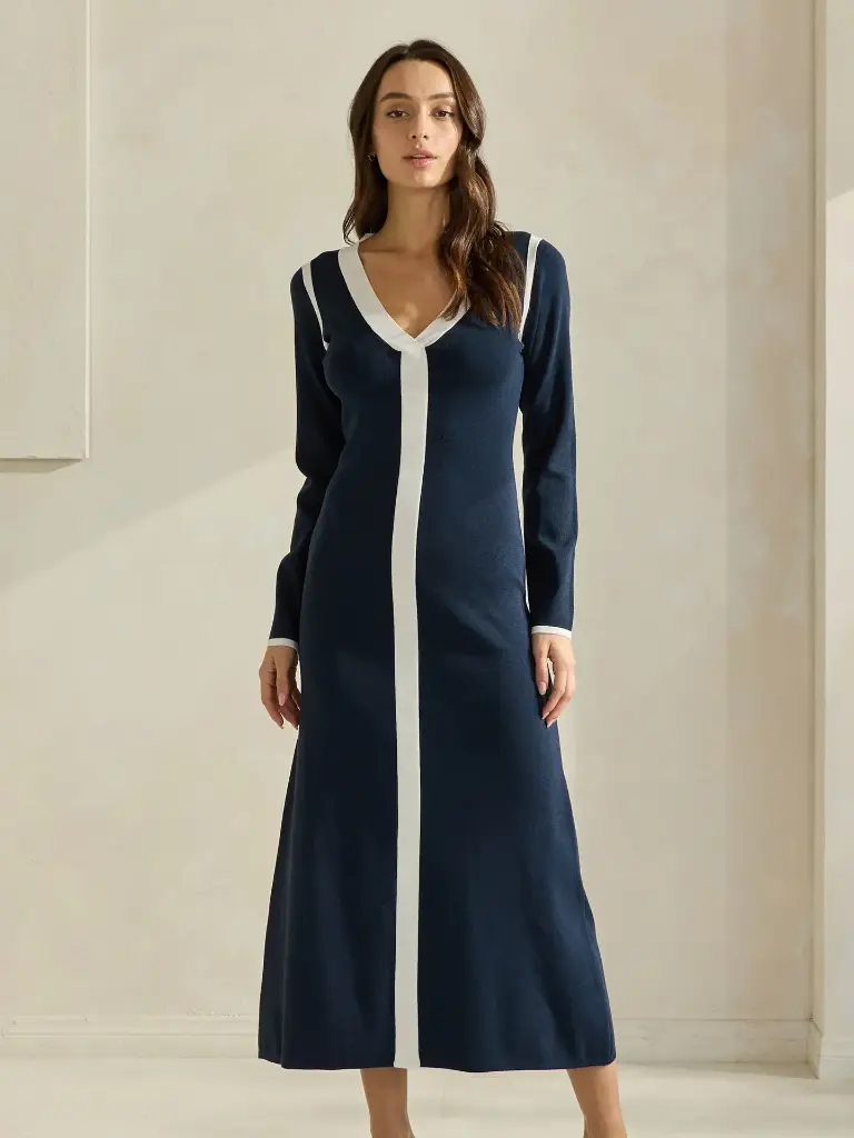 Vestido punto, azul marino, con contraste, midi. Para tu referencia la modelo lleva la talla S.