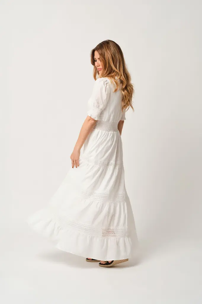 Maxi vestido blanco de verano con detalle en la falda y mangas. Estilo bohemio que no falla con capazo de verano, sandalias o cuñas. Para tu referencia la modelo lleva la talla S.